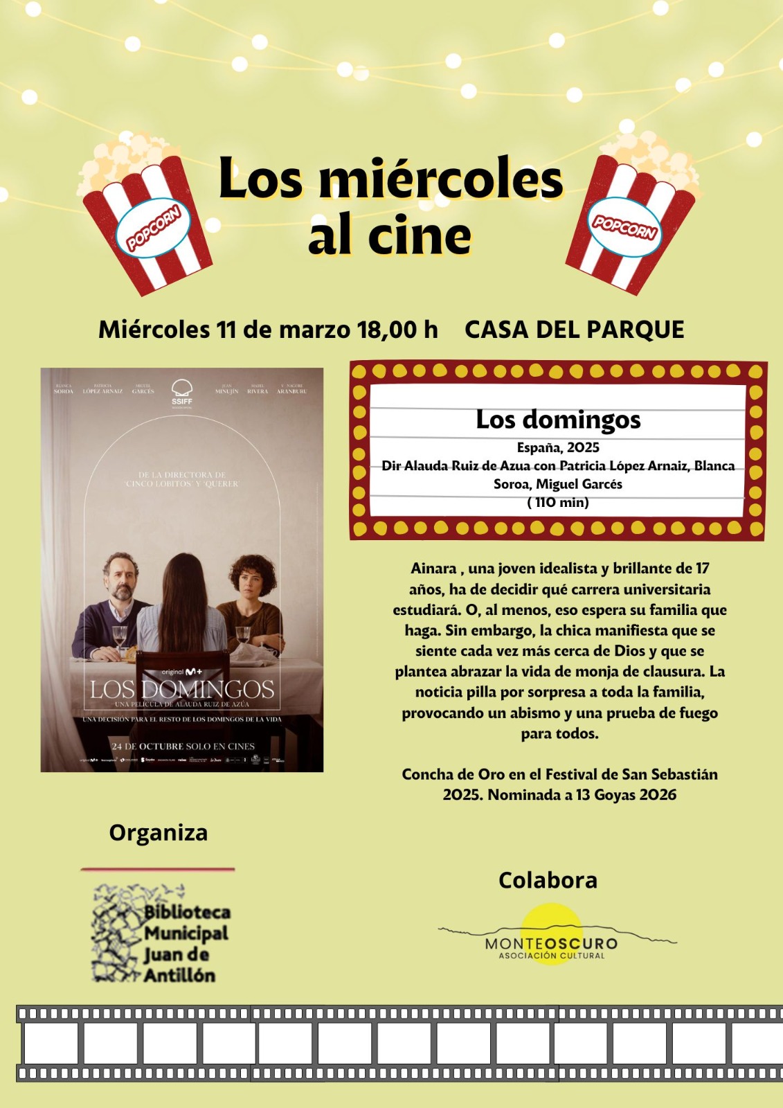El próximo miércoles 11 de marzo, a las 18:00 horas, en la Casa del Parque, tendrá lugar una nueva sesión de “Los miércoles al cine”, con la proyección de la película “Los domingos” (España, 2025), dirigida por Alauda Ruiz de Azua.