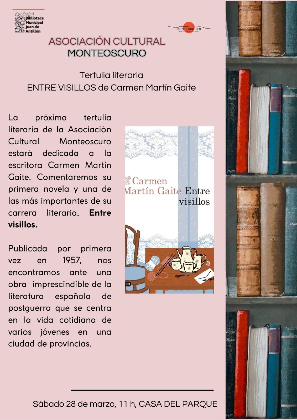 El sábado 28 de marzo, a las 11:00 horas, en la Casa del Parque, tendrá lugar una tertulia literaria dedicada a Carmen Martín Gaite, en la que se comentará su novela Entre visillos.