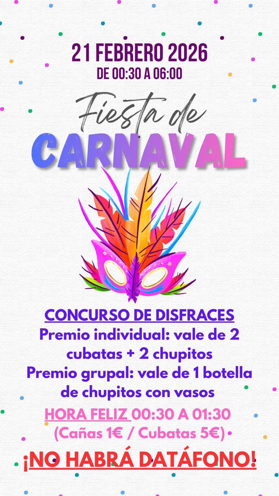A partir de las 00:30 horas gran Fiesta de Carnaval con concurso de disfraces.