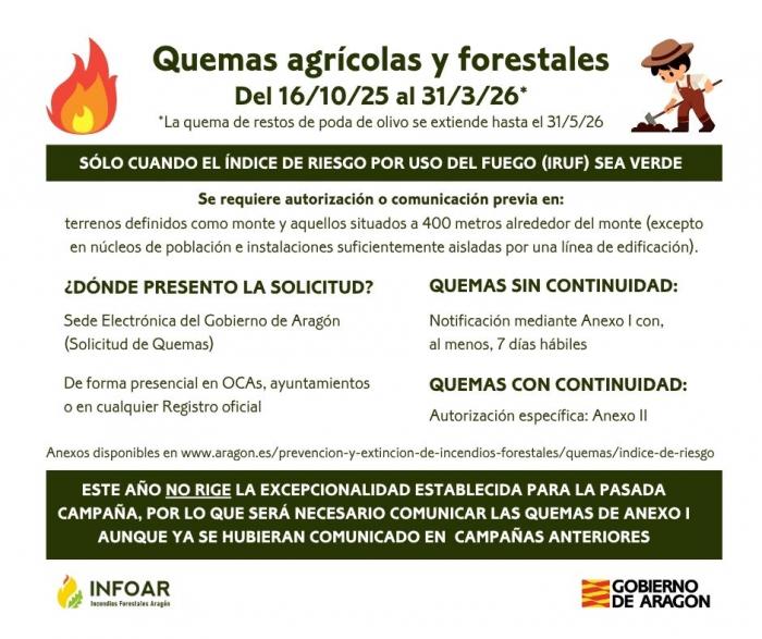 A partir del 16 de octubre se pueden presentar las comunicaciones y solicitudes de autorización para quemas, ya sea presencialmente en las oficinas municipales o a través de la aplicación web de usos del fuego del Gobierno de Aragón. La comunicación debe hacerse con al menos 7 días hábiles de anticipación a la fecha de la quema.<(...)