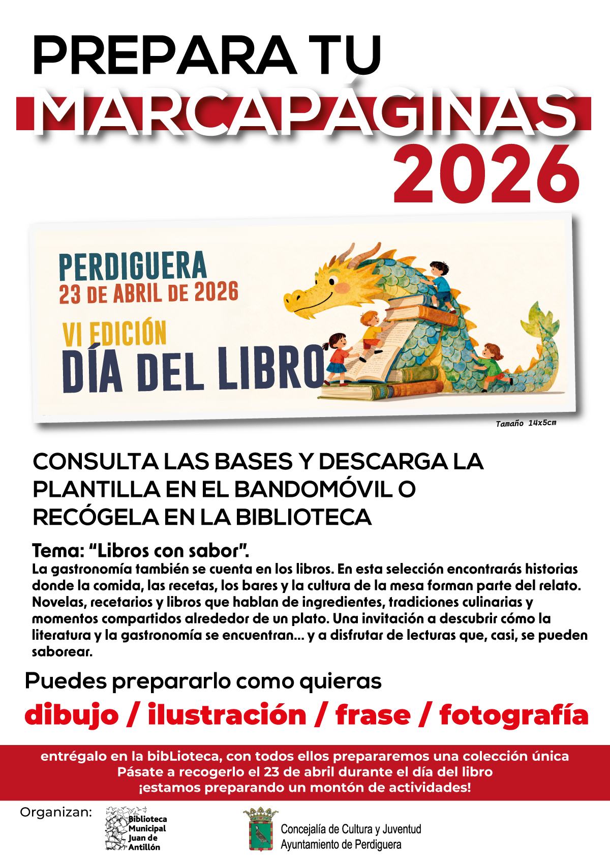 Este 23 de abril, la Concejalía de Cultura y la Biblioteca Municipal, en colaboración con la Asociación Cultural Monteoscuro y la Asociación Folclórico Musical de Perdiguera, preparan una programación especial de actividades para celebrarlo:Como en ediciones anteriores, te animamos a sumarte al concurso de diseño de marcapáginas, que este año tiene como tema “Libros con sabor”. 🖌️ Tus propuestas deberán inspirarse en el mundo de los libros y la(...)